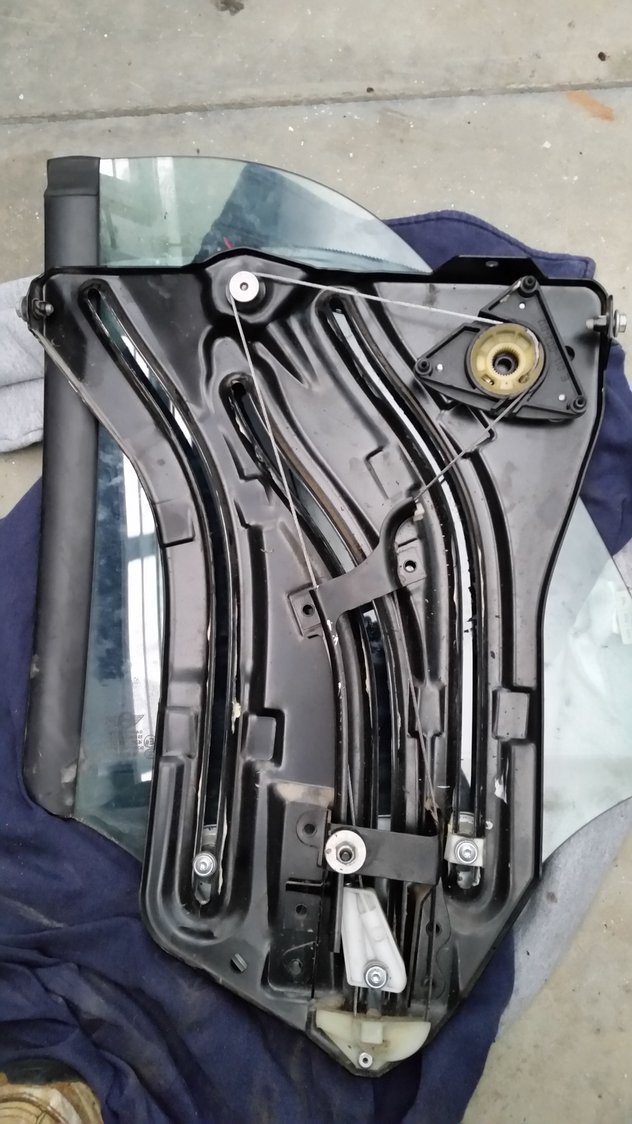 Pass rear window regulator was wound up around the spool... I pulled it apart, straightened the bends in the wire rope and wound it up again... It broke the blue wheel, so I fab'd one quickly out of aluminium... Not my best work, but it is hidden...