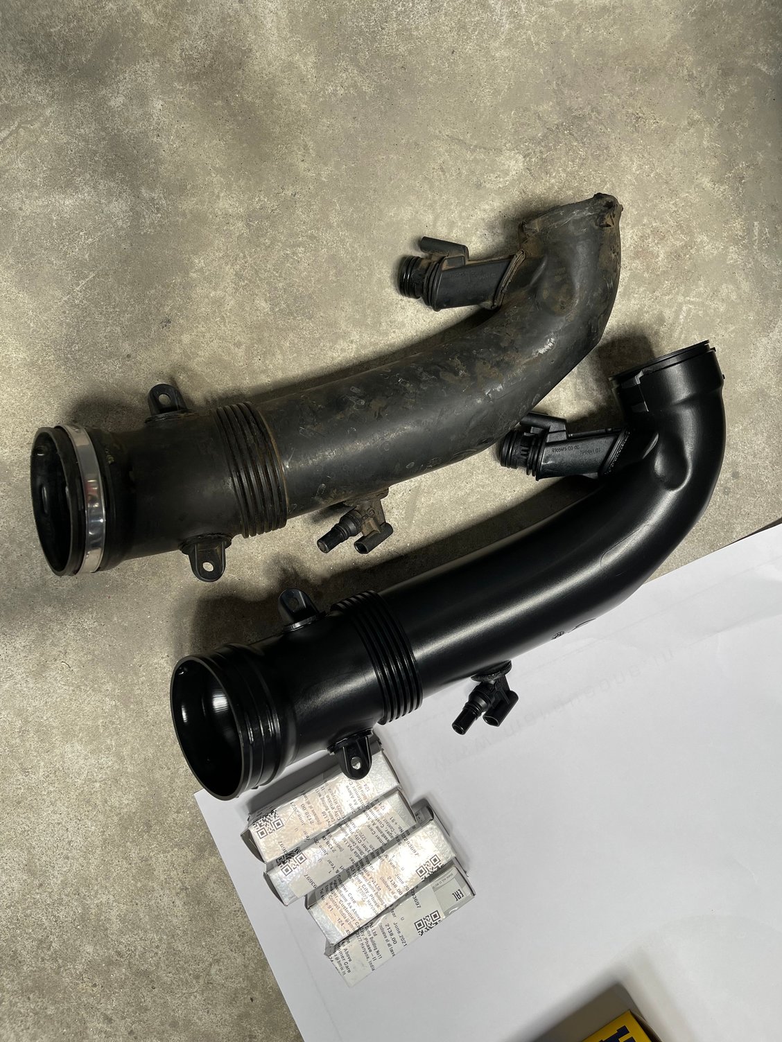 Poor little Cooper and its engine all opened up… The car sitting there and the new parts waiting to be mounted The old and the new Turbo Hose. Clearly can see where the old one is frayed at the edges. New OEM MINI Turbo Intake Hose… OEM MINI Turbo Intake Hose New OEM Mini BERU Spark Plugs