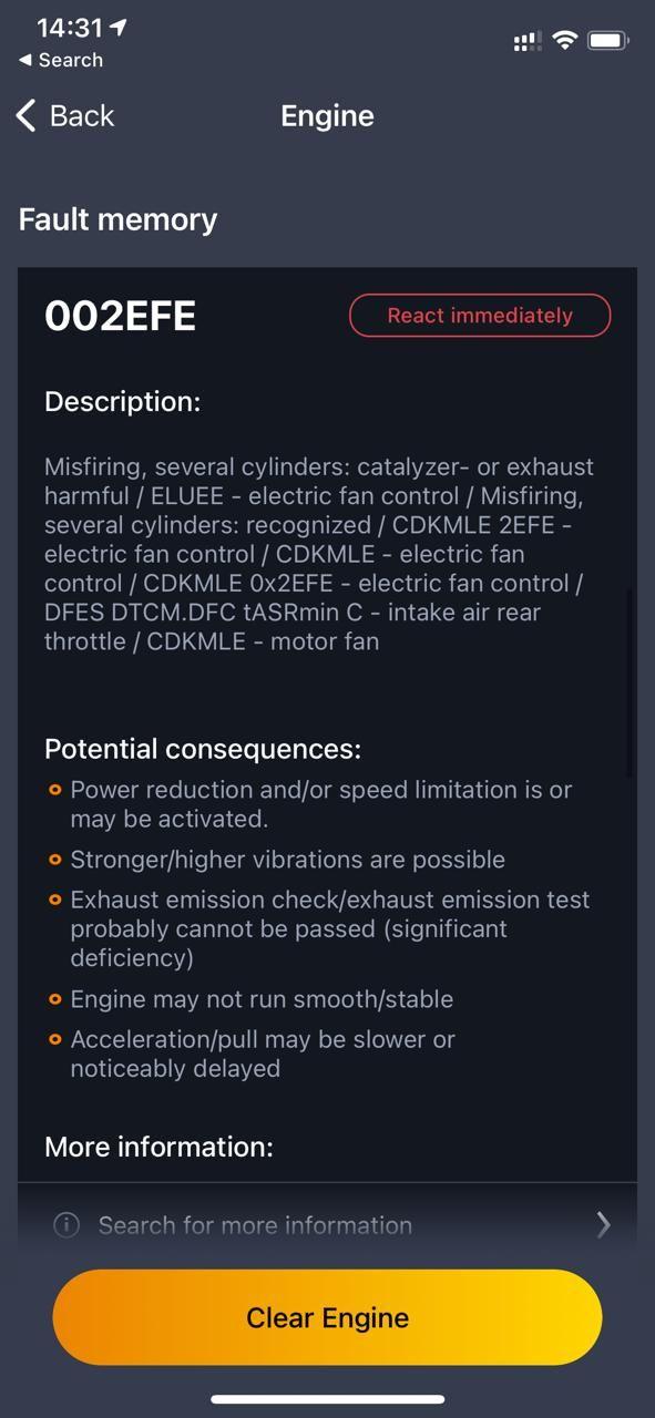 And upon scanning it again, the error code that came up was 37DE. Engine Ventilation Heating, activation. Line disconnection, followed by 2EF7 Engine Misfire Fuel Injection deactivation. Etc.
