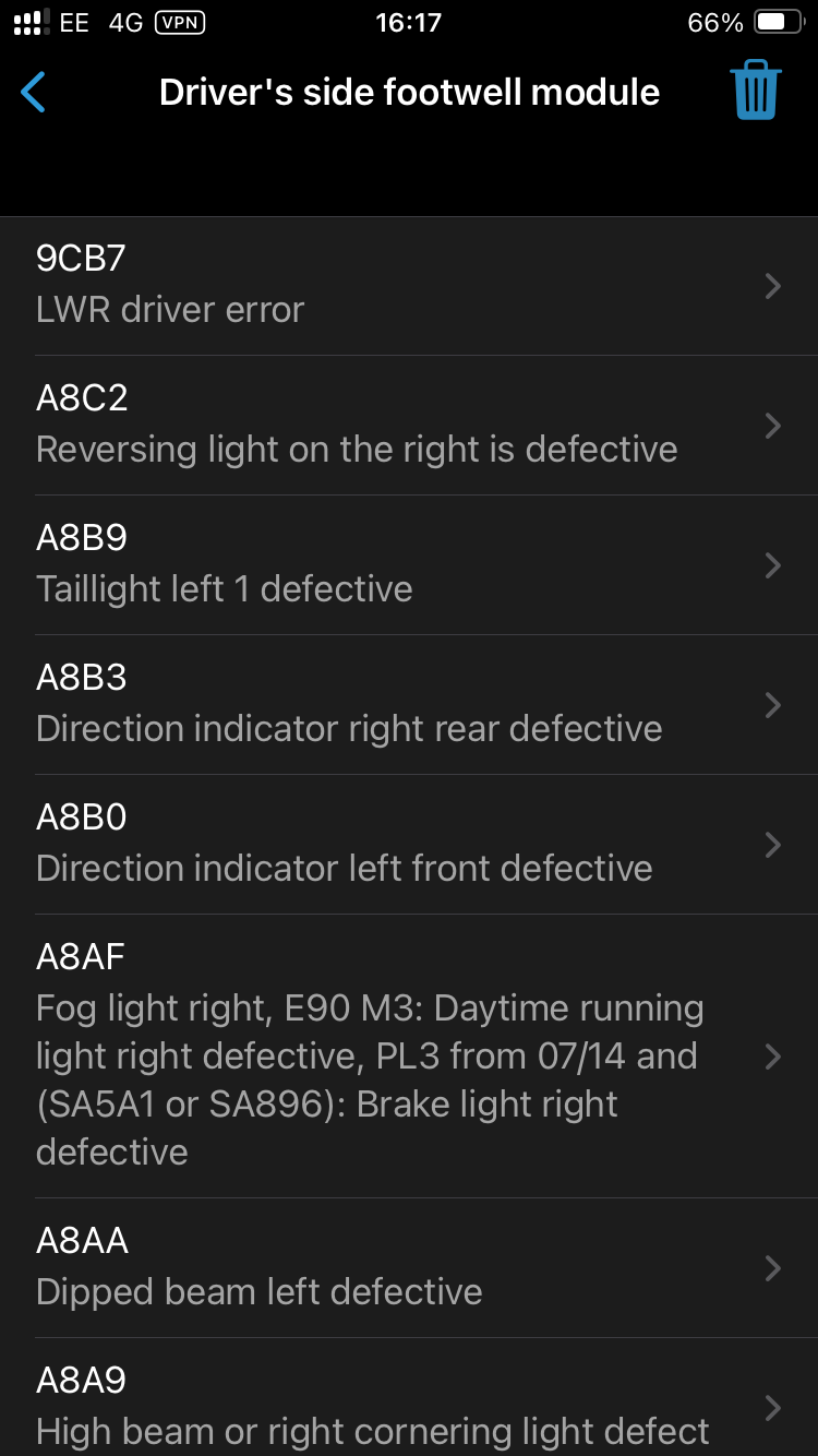 A few days later I started getting intermittent issues with the indicators, then last week I got a whole host of error codes (12) at once from the footwell module.