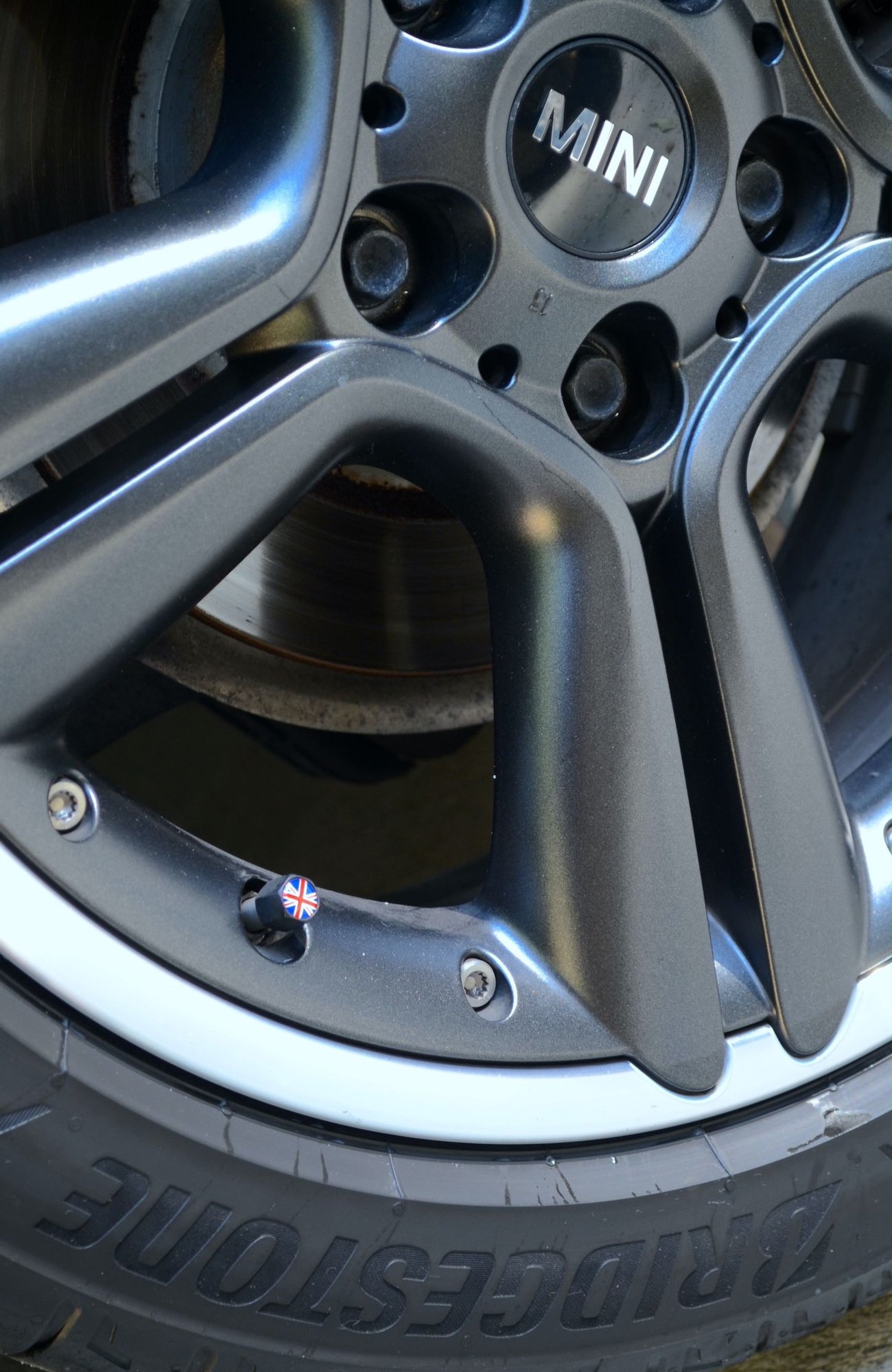 Union Jack valve stem caps (keychain wrench in glovebox)