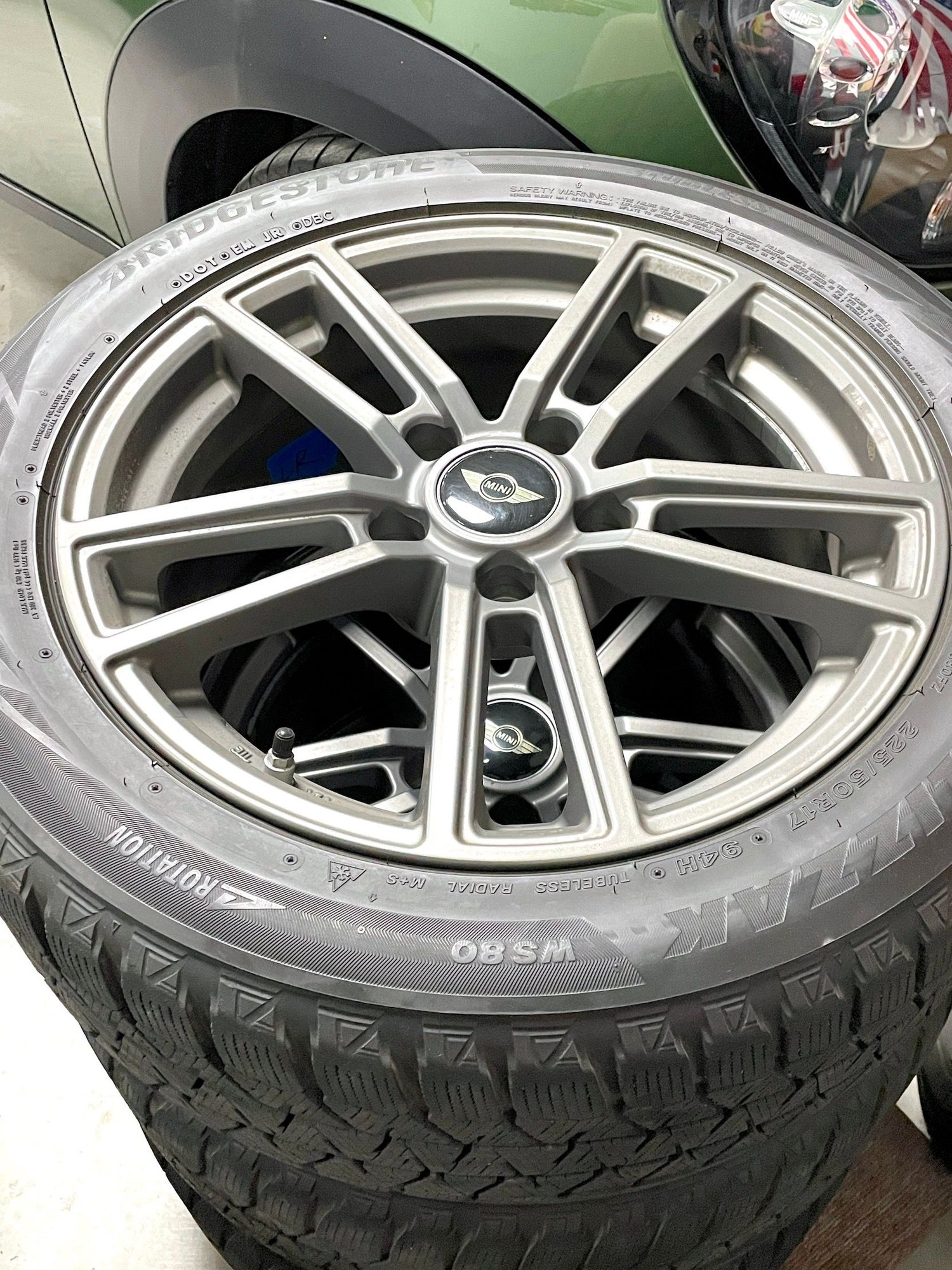 Full set of Bridgestone Blizzaks (1-2 seasons left) on 17” Titano Monte wheels (w/MINI center caps)