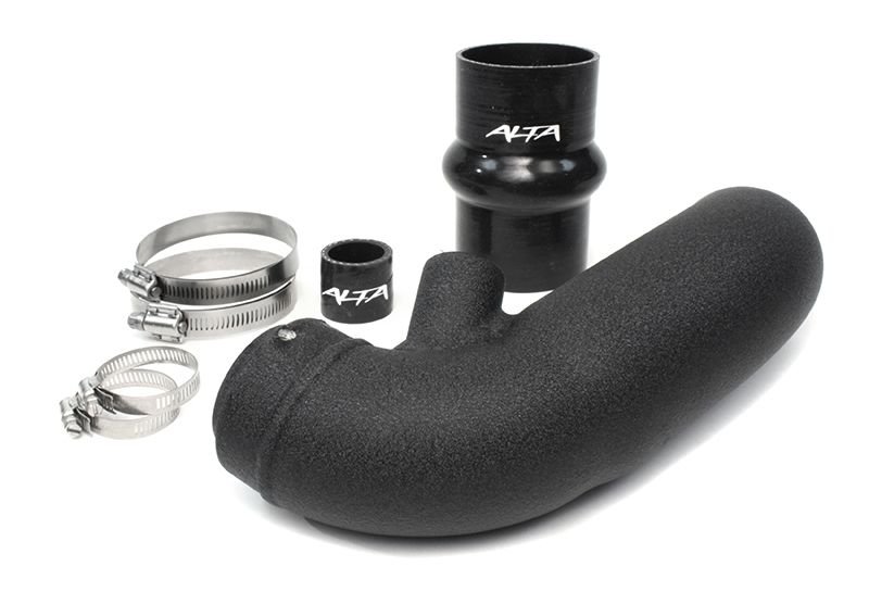 As the OEM turbo inlet hoses rubber on your MINI Cooper S and the plastic on your MINI Cooper S JCW ages, the material becomes harder and begins to fail. Vibrations and normal maintenance (like replacing air filters) leads to premature failures where the hose meets the turbo. When these failures happen, Check Engine Lights will occur as well as a huge loss in performance. These problems will NOT happen with the ALTA Turbo Inlet hose as it is made of aluminum and seals with O-rings to ensure a lifetime of leak-free performance. CONSTRUCTION - ALUMINUM COUPLER The mouth of the ALTA Turbo Inlet Tube features a CNC'd aluminum coupler. With its precision machined openings, and dual o-ring grooves makes the ultimate seal, with no leaks to mess with your idle or rob you of power. The back edge of the coupler features a traditional style air horn, like those found on race cars, which provides smooth air transition to the turbo inlet. This level of quality and attention to detail is simply not found elsewhere. CONSTRUCTION - ALUMINUM PIPE The ultra smooth interior of the ALTA Turbo Inlet Tube is formed from mandrel bent aluminum tubing. Smoothly transitioning from the filter to the throttle body. Eliminates turbulence and intake restrictions. SIZE ADVANTAGE A side-by-side comparison of the ALTA and OEM turbo inlets clearly illustrates how the ALTA inlet has the largest possible inside diameter. Which simply means more horsepower and better turbo response! Starting immediately after the turbo our 2.62" diameter inlet has a smooth 2.37" diameter bend and then cleanly transitions to 1.82" at the throttle body. FINISH Powdercoated for protection against the elements, the textured finish will look awesome for years to come.