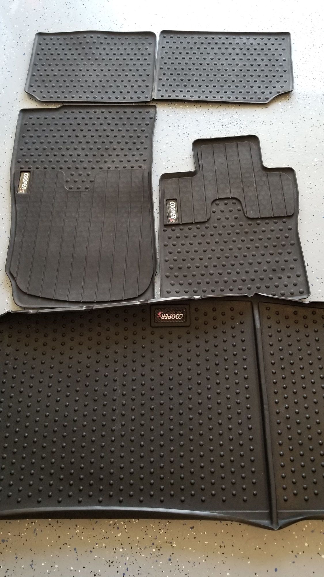 Genuine MINI All Weather Rear OEM Mats part # 51-47-2-181-810 Rear 2, rubber, Cooper S Logo